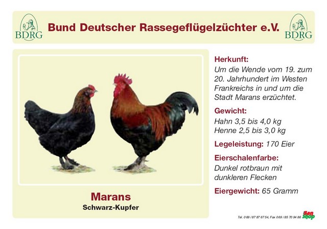 Marans ist die Bezeichnung einer großen Hühnerrasse, die in Frankreich um die Stadt Marans erzüchtet wurde. Die Zucht lässt sich bis auf die Mitte des 19. Jh. zurückverfolgen. In Deutschland ist die Rasse seit 1979 anerkannt und im Gegensatz zu Frankreich vor allem in Kupfer-Schwarz und Gold-Sperber gezüchtet. Auch Silber-Sperber wird gezüchtet. Seit 2011 sind auch die Farbschläge schwarz-silber und blau-kupfer durch den Bund Deutscher Rassegeflügelzüchter anerkannt. Mit den Zwerg-Marans gibt es auch eine Zwerghuhnrasse, die vom gleichen Sonderverein betreut wird. [Quelle]